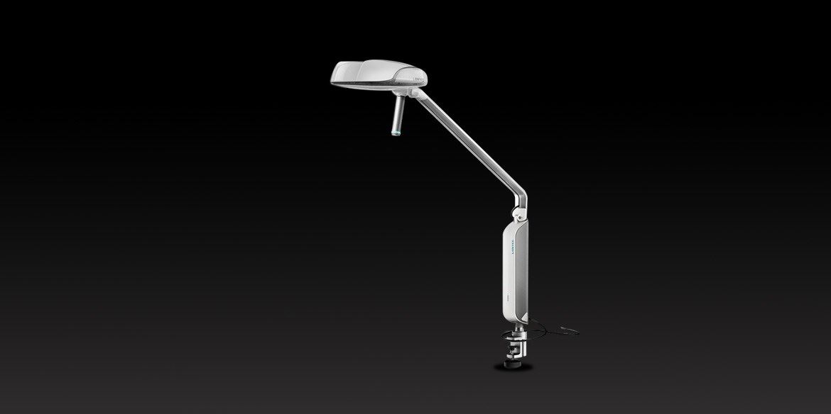 整體采用干凈的乳白色和銀色的搭配,可以大幅度的角度調(diào)整,對工作也又更好的幫助。品牌logo放置燈體下部,大小與機體完美配合,完美展示。